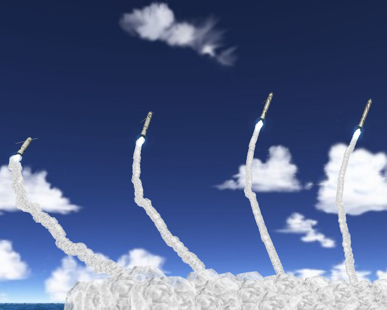 静かだった東北地方の暗色の海面を突き破り、天高く舞い上がる四条の白煙。 ![]() 海中から放たれた4発の巡航ミサイルは、一旦安全な飛翔態勢をとる為に高度を稼いでから、安定した水平飛行に入ると素早く 海面近くまで降下した。 ブースターを切り離して安定した巡航態勢に切り替わってからは、対空レーダーによる探知を避ける為に波打つ海面スレスレを 飛んでいく。 これらのミサイルは遥か上空、地球の軌道上に浮かぶ衛星からの測位誘導を受けている。目指す先は――― |